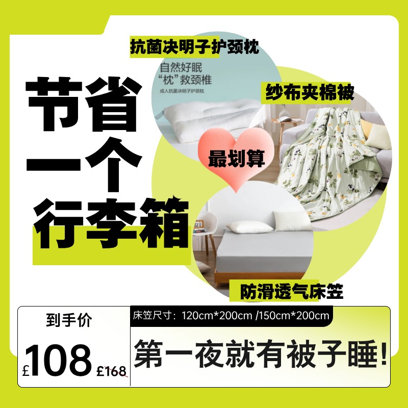 新生季床品送到家·套装二 内含决明子护颈枕*1 纱布夹棉被*1 防滑透气纯棉床笠*1